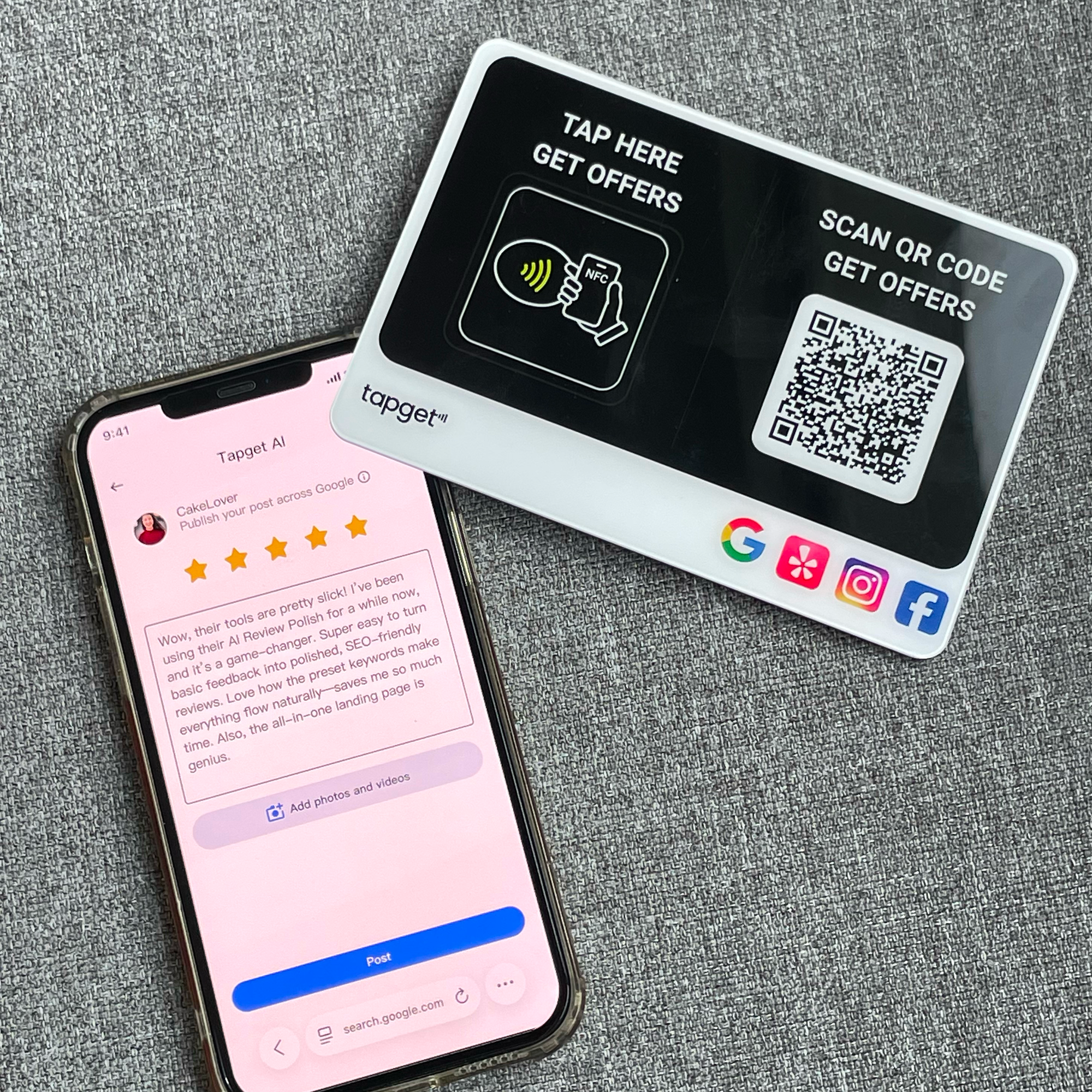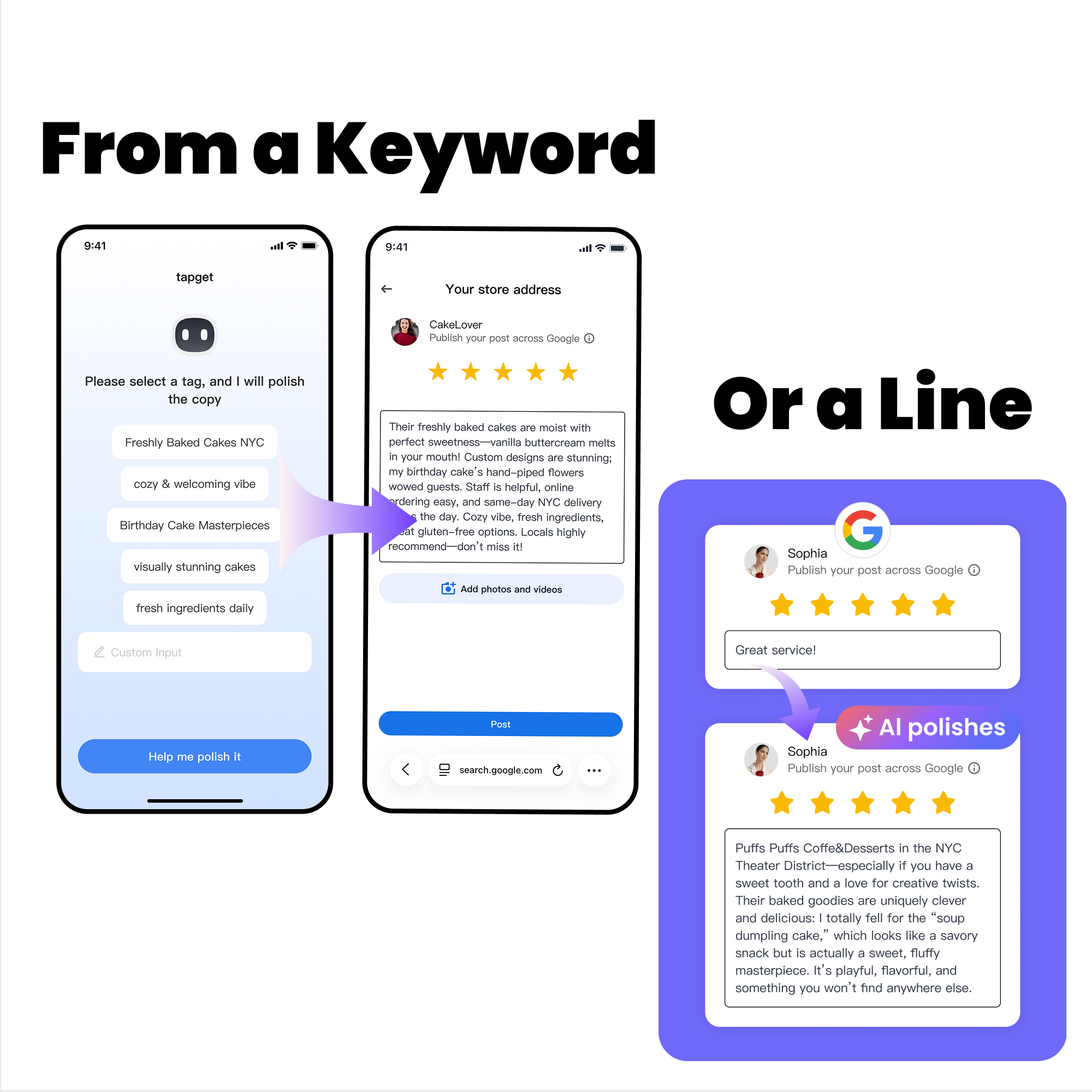 Tapget AI learns your business from your Google listing and best-selling items, whether a guest types one line or just taps a preset keyword, the AI combines their input with your strengths and fills out a natural, detailed review that highlights the products and service you want to promote.